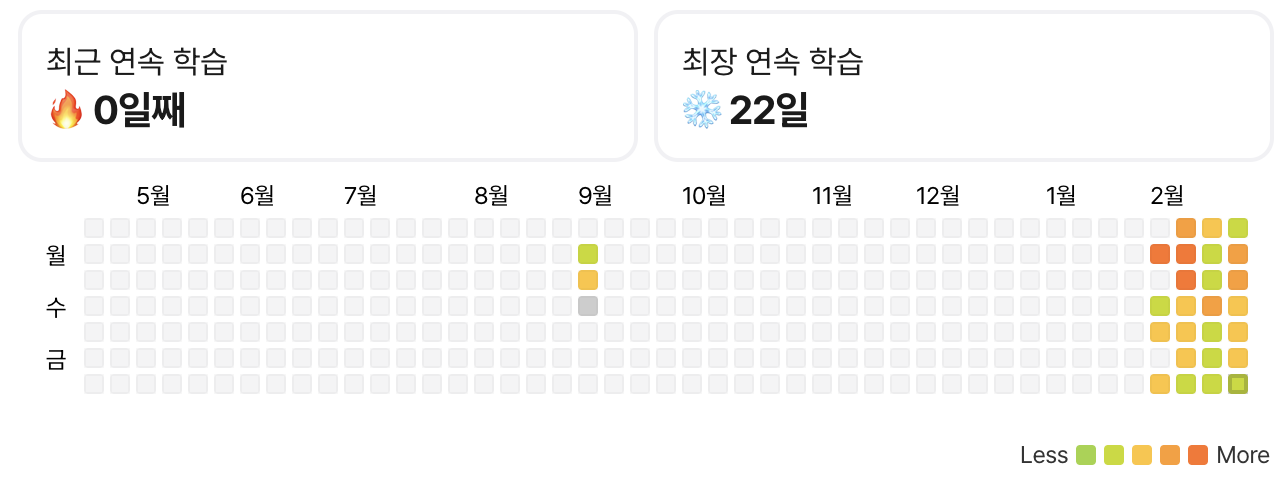 알고 바보이기 때문에 겸손하게 Lv2부터 시작했는데, 생각보다 쉬워서 중간부터는 Lv3을 동시에 풀었다. 그리고 매일 Streak 달성하는 게 좋아서 쉬운 문제라도 꾸준히 풀려고 노력했던 것 같다.