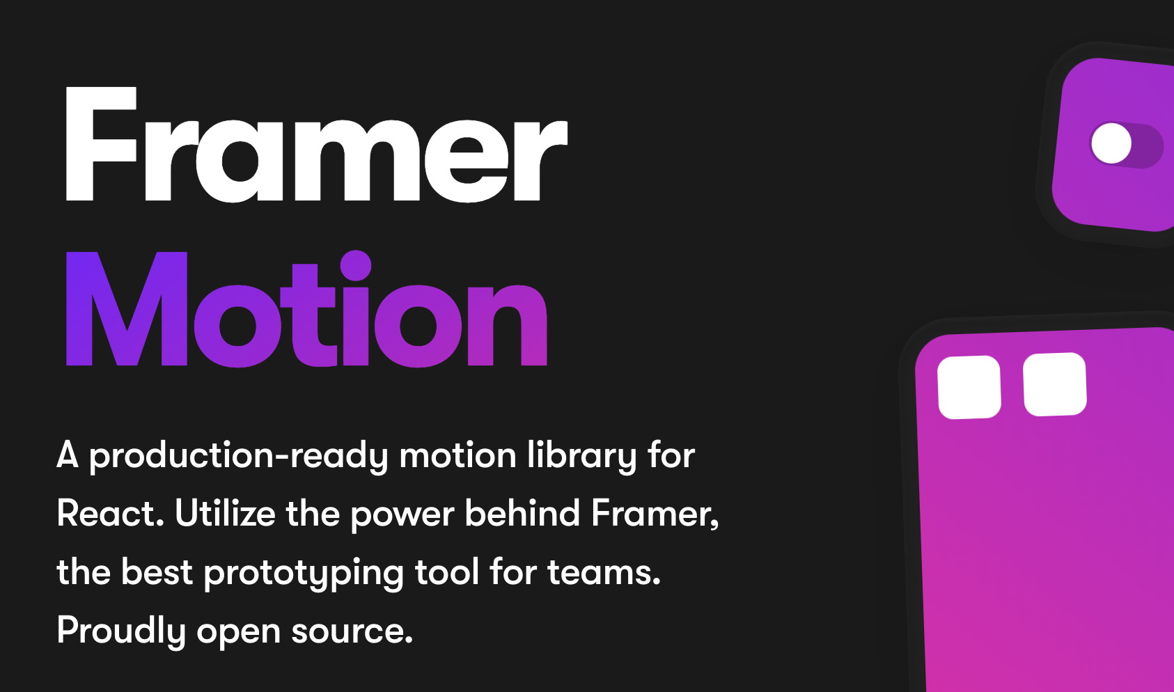 Framer는 interactive 디자인을 도와주는 툴인데, 그중에서 Motion은 리액트를 위한 production-ready(실제 제품 단계의) motion library를 표방하며, 오픈 소스로 공개되어 있다. 특징으로 내세우는 것 중 하나는 effortless layout transitions and gestures, 즉 transition과 gesture를 고려할 때 노력이 필요없다..!는 점이다.